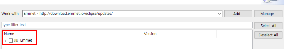 2. Work with 입력란에 http://download.emmet.io/eclipse/updates/ 입력 후 Add.. 클릭