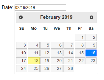 <!doctype html><html lang="en"><head> <meta charset="utf-8"> <meta name="viewport" content="width=device-width, initial-scale=1"> <title>jQuery UI Datepicker - Default functionality</title> <link rel="stylesheet" href="//code.jquery.com/ui/1.12.1/themes/base/jquery-ui.css"> <link rel="stylesheet" href="/resources/demos/style.css"> <script src="https://code.jquery.com/jquery-1.12.4.js"></script> <script src="https://code.jquery.com/ui/1.12.1/jquery-ui.js"></script> <script> $( function() { $( "#datepicker" ).datepicker(); } ); </script></head><body> <p>Date: <input type="text" id="datepicker"></p> </body></html>